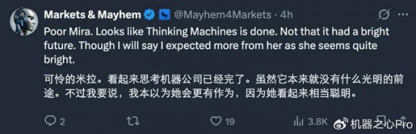 无论真相如何,这次事件都将给 Thinking Machines Lab 带来一些打击。甚至有悲观的网友认为,这家公司「已经完了」。