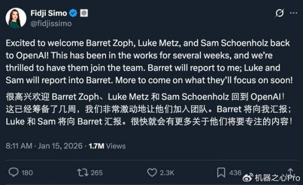 昨天,我们报道了前 OpenAI CTO Mira Murati 创办的 Thinking Machines Lab 出现重大人事变动的消息:联合创始人兼 CTO Barret Zoph 被解雇,另一位联创 Luke Metz 以及创始团队成员 Sam Schoenholz 也一起离开,三人一起回归 OpenAI。