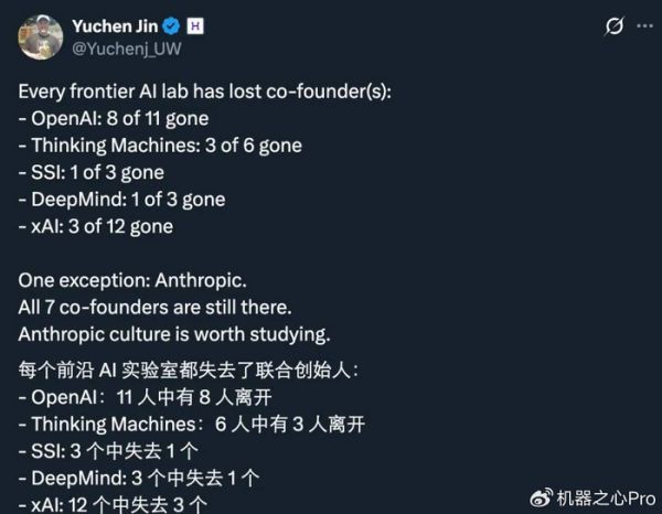 不过,在失去「联创」这件事上,Thinking Machines Lab 倒也并不孤独,有人统计了最近几年头部 AI 公司的人员流动情况,发现联创出走比大家印象中还要频繁。