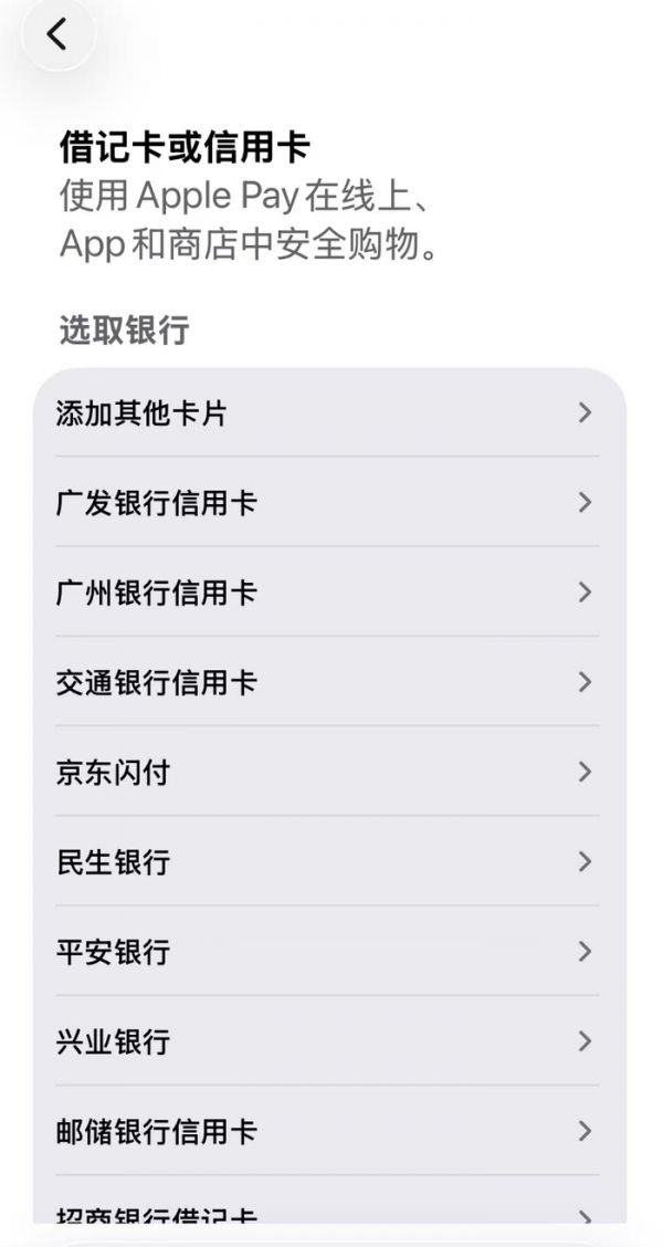 目前Apple Pay支持工商银行、中国银行、农业银行、交通银行、招商银行、中信银行、平安银行、兴业银行发行的VISA信用卡,浦发银行、建设银行、民生银行、光大银行等VISA信用卡还要等后续功能适配。