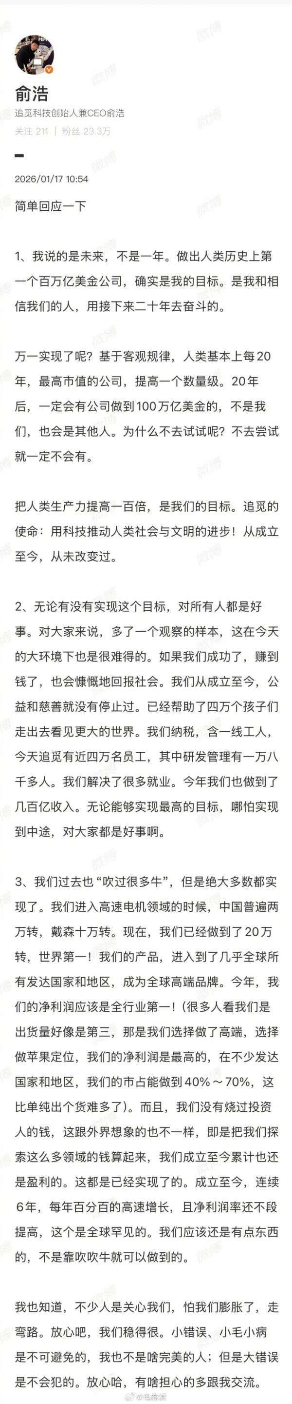 #追觅CEO回应被指膨胀# 追觅科技CEO俞浩发声:过去“吹过很多牛”,但大多都实现了,怼人的员工早就提出离职,我有肚量,不会在意。