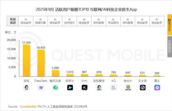 QuestMobile数据显示,去年9月,豆包以1.72亿月活,稳居AI原生App榜单第一。12月,又有市场消息传出,豆包的日均活跃用户数(DAU)已突破1亿大关。
