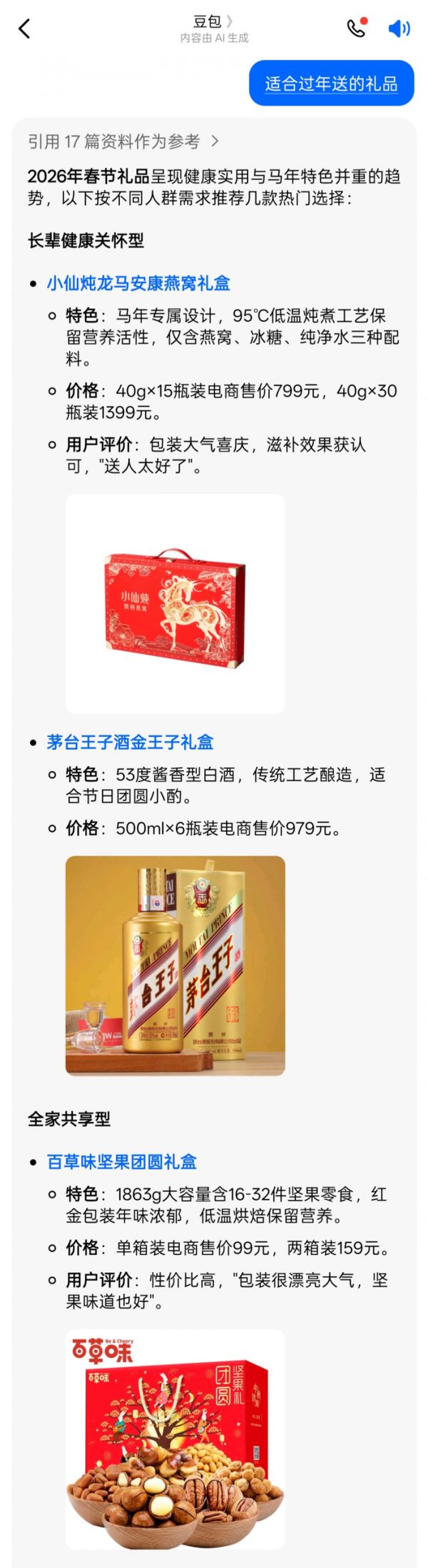 例如,当我们输入“适合过年送的礼品”指令时,豆包会根据关键信息提供相应的商品选择,还会附上商品链接、价格以及图片等信息。