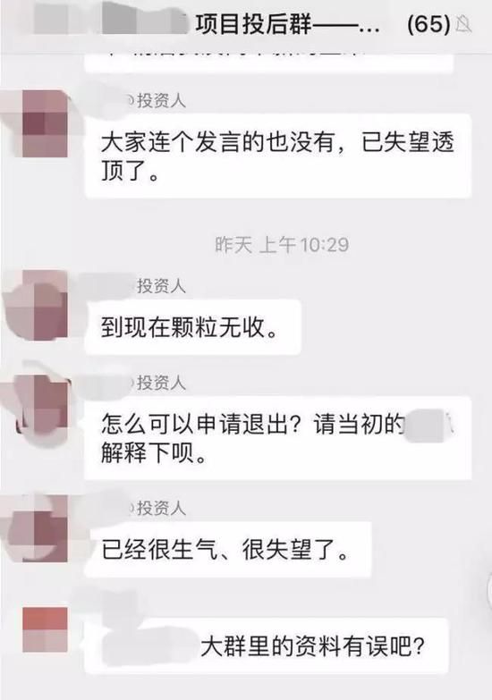 “中途有很多次去申请退出项目,但是都被对方说服了。”王进称,每次作出退出申请,马上众筹项目方就会在群里忽悠,要么是产品进展良好,要么是没有任何一个投资人退出,要么就是马上就要到收获的时候了,现在退出很可惜……“总之就是千方百计不让退款。”面对这样的局面,王进只能选择默默接受。