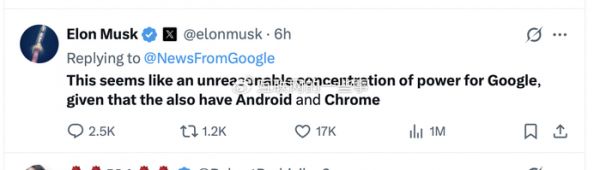 消息公布后,埃隆·马斯克在社交媒体平台X上表达了不满。他认为谷歌已经拥有安卓和Chrome,加之现在进入苹果核心AI系统领域,可能会导致“不合理的权力集中”。