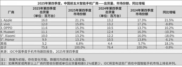 一份则是 2025 年第四季度中国手机市场报告,显示在一众国产手机品牌下滑的背景下,iPhone 不仅再一次保住了第四季度第一的宝座,更同比去年大增 21.5% 至 1600 万台,主要则是得益于这代 iPhone 17 系列对于国内消费者依然极具吸引力。