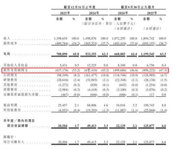 2023年至2025年前三季度,半亩花田的销售及营销开支分别为6.37亿元、6.77亿元和8.96亿元,占当期总收入的比例高达53.1%、45.2%和47.3%。
