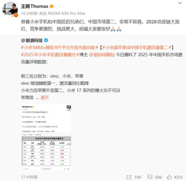 图源:微博此前,他还曾转发小米手机的市场数据,并写道:“恭喜小米手机和中国区的兄弟们,中国市场第二,非常不容易。”