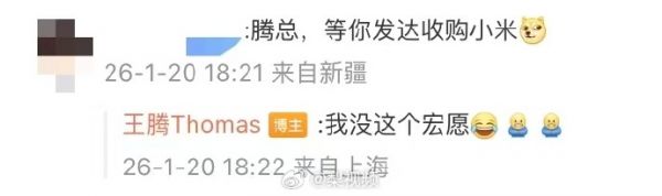 面对“等你发达收购小米”的调侃,王腾直言:“我没这个宏愿【哭笑】。”
