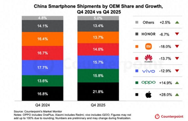 报告显示,凭借 iPhone 17系列基础款存储容量翻倍但不涨价,以及Pro系列的新相机设计等因素带动,苹果以22%的市场份额领跑2025年四季度的中国手机市场。