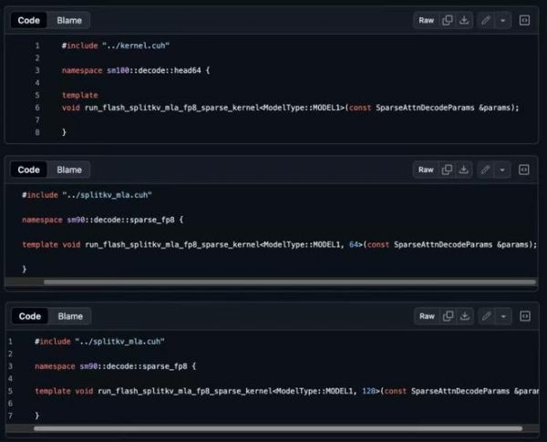 ▲DeepSeek代码库出现MODEL1相关(图源:X)这一名称不仅出现在SM90架构相关的.cu内核实例化文件中,还贯穿在多个针对FP8稀疏解码路径的模板定义与内存布局注释里。