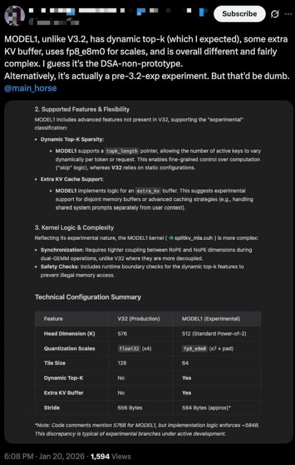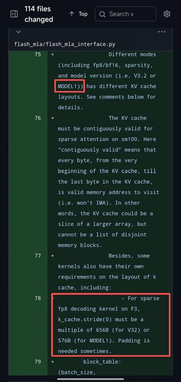 ▲海外网友推文截图(目前该条注释已于代码库内删除)这一配置区别于V3.2的656B,暗示着MODEL1对底层内存对齐和调度有更为严格的要求,可能与其更复杂的运行时行为与动态缓存机制有关。