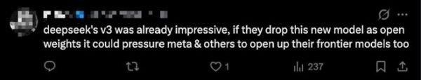 而另一位开发者则认为,如果DeepSeek再次开放权重,势必将对闭源巨头形成压力,推动前沿模型进一步走向开放。