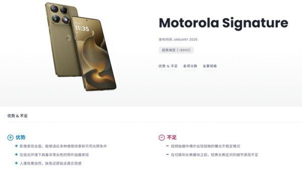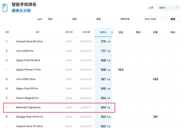 来自DXOMARK的智能手机影像排名,联想Motorola Signature(moto X70 Air Pro)的总分164分,与荣耀Magic8 Pro分数相同,排在第七位,排名、分数甚至要超过影像旗舰华为Pura70 Ultra、小米15 Ultra,iPhone 16 Pro Max、OPPO Find X8 Pro。