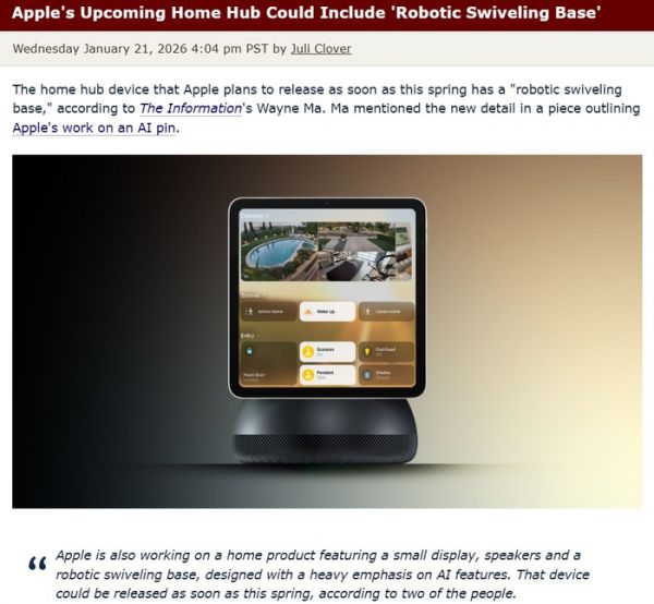 苹果首款AI家居中枢曝光,带屏可转头今春发布