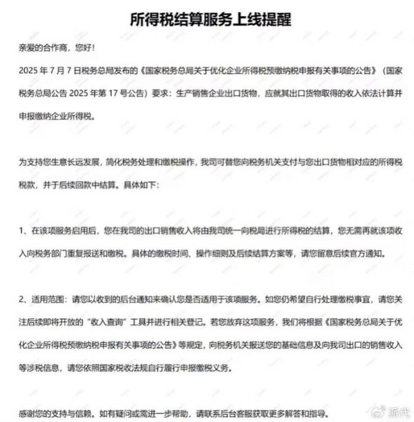 不少人晒出平台推送的《所得税结算服务上线提醒》,核心就一句话:以后你的出口销售收入,可能要由平台先扣税再结算回款了。
