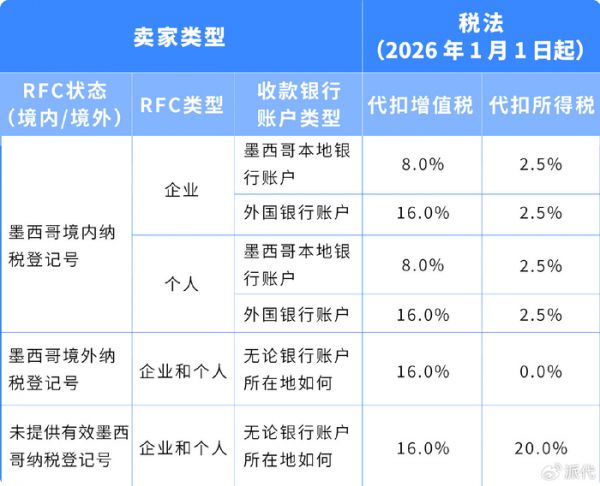 墨西哥则是2026年海外代扣税新规的焦点市场,今年1月1日起正式实施增值税和所得税双重代扣新规,给在当地运营的卖家带来不小冲击。
