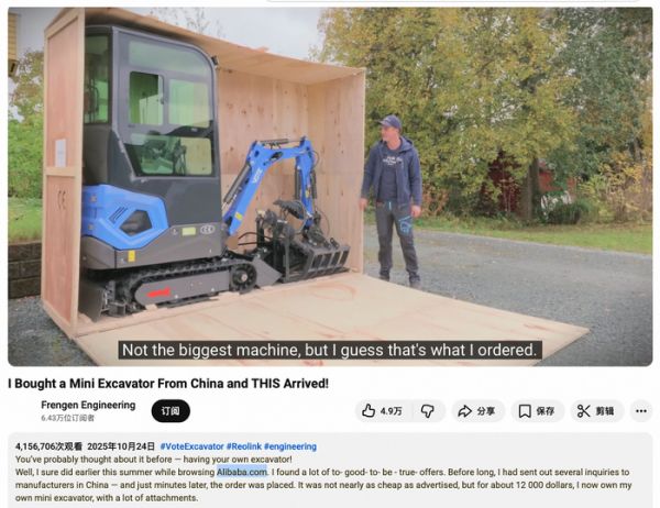 然而,三个月后,当实物运抵挪威,Frengen被彻底震撼:这并非玩具,而是一台功能齐全、结构扎实、性能甚至超越许多本土品牌的小型工程机械。于是,他将这次开箱、组装到试用的全过程制作成视频上传至YouTube,结果迅速引爆流量,观看量突破415万次。