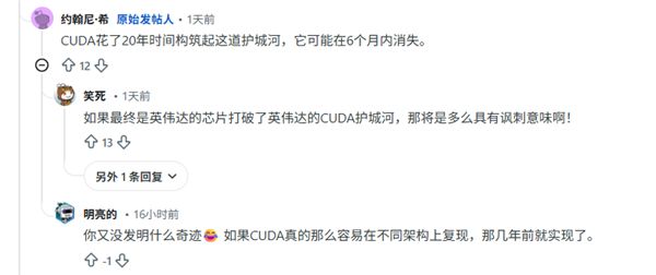 “CUDA花了20年时间构筑起这道护城河,可能在6个月内消失。”johnnytshi说。
