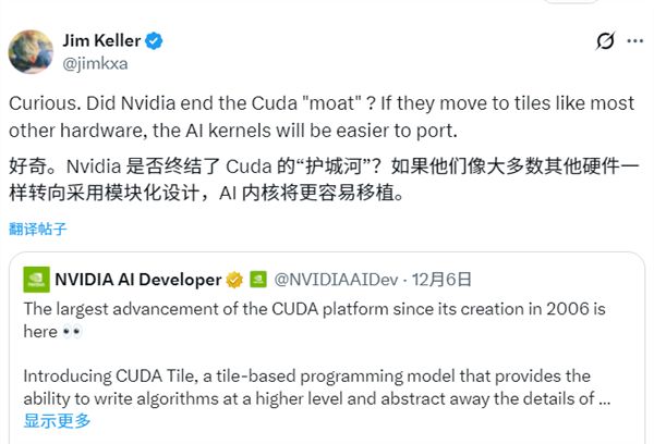 芯片设计界资深人物、曾参与AMD Zen、苹果A系列和特斯拉Autopilot设计的Jim Keller认为,如果未来的主流GPU编程逐渐转向这种Tile-based方式,开发者一旦习惯了这的模式,那么同一套程序逻辑就更容易移植到不同的GPU硬件上,不像过去的CUDA那样高度绑定NVIDIA硬件,这可能会给AMD、Intel或新兴的AI公司提供切入机会。