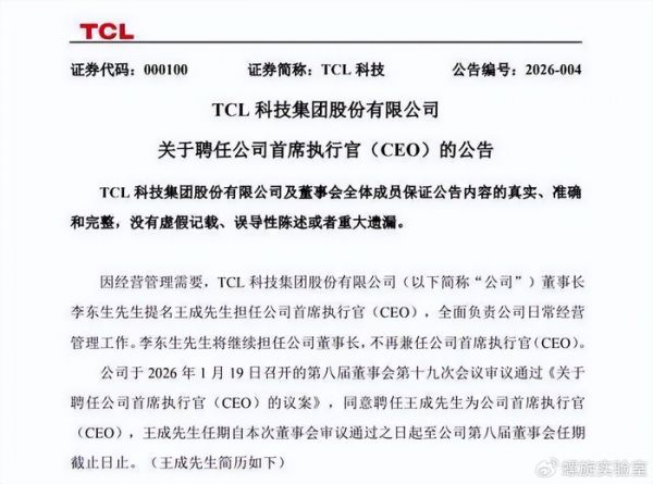 就在索尼与TCL签署合作意向备忘录的同时,TCL科技集团发布了一则人事变动公告:创始人李东生卸任CEO职务,仅保留董事长一职,由70后“老将”王成接任CEO。