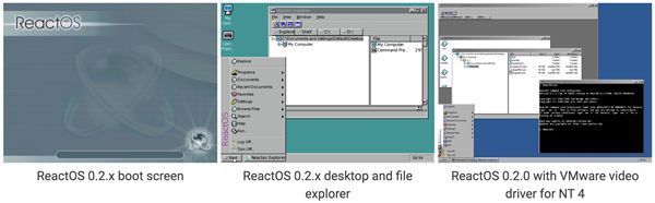 ReactOS在2003年2月首次发布了0.1.0版本,首次实现从光盘引导,但仅有命令行界面,尚不具备图形桌面。