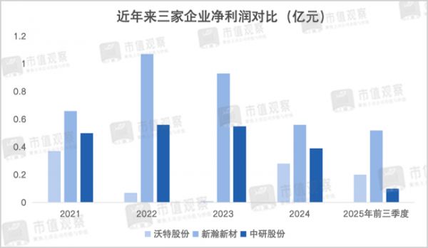从财务对比来看,2025年前三季度沃特股份的收入规模最高但盈利能力较低,实现归母净利润0.3亿,净利润率仅2.14%,而中研股份和新瀚新材的净利润率分别为5.04%和15.62%。