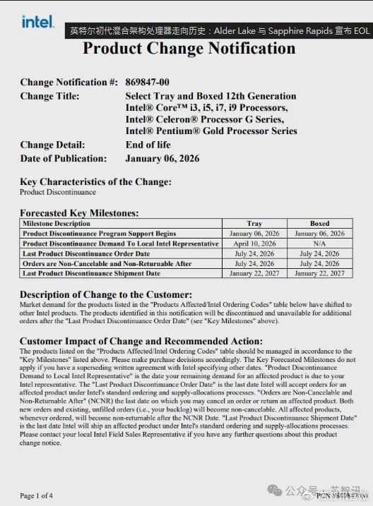 英特尔2025年已停产多款移动版Alder Lake 处理器,此次EOL含括了完整的面向桌面PC平台的产品阵容,包括盒装与散片产品,从入门级Celeron 到旗舰级Core i9 均在列。不过,Alder Lake 库存并不会立刻清空,英特尔允许渠道商在2026年7月25日前提交最终订单,最后一批产品的出货时间定在2027年1月22日,也就是说,市场仍有一整年的缓冲期进行库存清理。