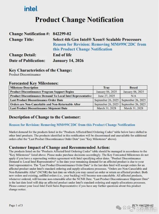 根据英特尔公布的信息指出,Sapphire Rapids Scalable 已于2025年9 月26日停止接受新订单,最终出货日期为2028年3月31日。同样,这一系列的技术支持也将后续转入Intel Embedded Architecture。