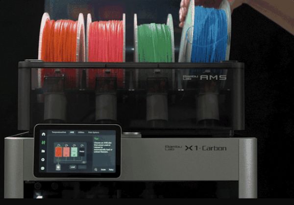拓竹开发的首代 AMS 自动供料系统。配合官方耗材卷上的 RFID 标签,AMS 能自动识别耗材颜色、余量,可以多台并联,在打印时自动切换更多颜色。AMS 本身也像个小机器人,内置 10 个传感器,打印时可以监控、控制耗材的位置、送料速度和张力。