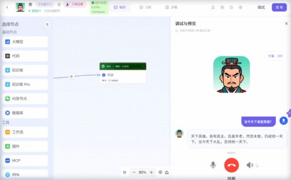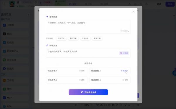 其中最直观的一个例子就是,将为智能体定制声音的时间压缩到了几秒钟。发布会的实际演示中,操作人员在讯飞星辰智能体平台生成了曹操人格的智能体后,通过自然语言描述想要的音色声线、输入试听文本、点击生成,就在几秒内合成4个候选音色。接着选择保存、应用音色后,用户就能与刚刚的曹操人格智能体进行语音聊天。