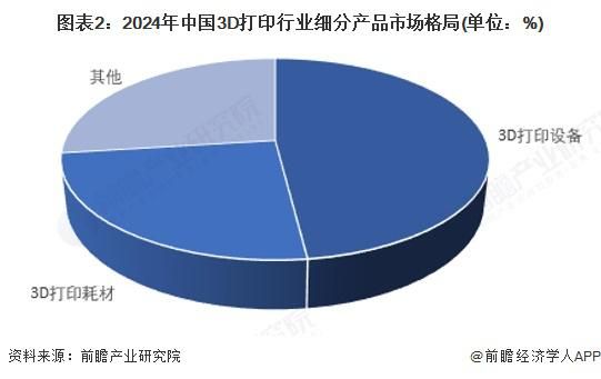 3D 打印根据产品及服务构成可以分为 3D 打印设备及零部件、耗材、软件以及 3D 打印服务四大板块。根据数据显示,2024 年 3D 打印设备市场和 3D 打印耗材市场是中国 3D 打印行业最大的两个细分产品市场,占比分别达到 48% 和 25%。