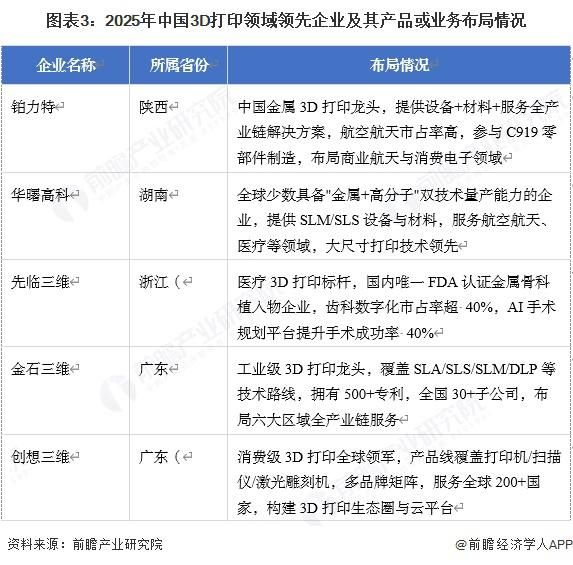 中国 3D 打印呈梯队竞争格局:铂力特、华曙高科主导工业级金属打印,创想三维、拓竹科技垄断消费级市场 ; 竞争聚焦技术突破、材料创新与应用拓展,头部企业加速并购整合,中小企业深耕细分场景,国产替代提速且全球份额领先,部分企业具体布局情况如下: