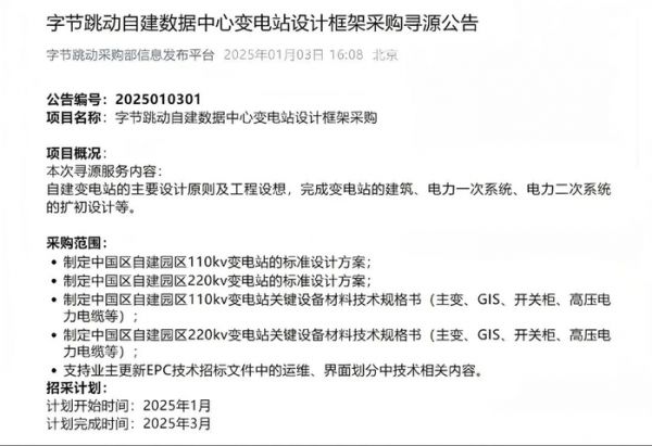 今年年初,字节更是发布了《字节跳动自建数据中心变电站设计框架采购寻源公告》,计划采购自建变电站的主要设计原则及工程设想,完成变电站的建筑、电力一次系统、电力二次系统的扩初设计等,自建数据中心变电站支持算力。