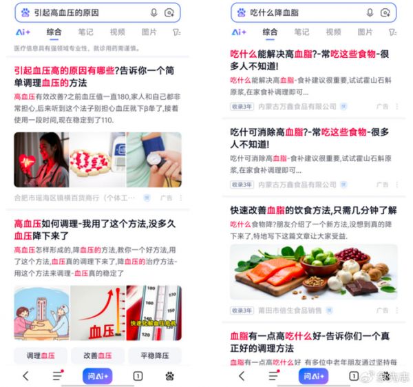 我还测试了其他医疗保健相关场景,比如“引起高血压的原因”、“吃什么降血脂”等,返回结果都是同样一套模式。