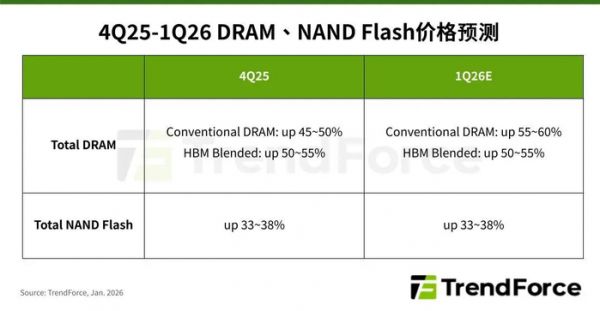 集邦咨询最新调查认为,2026年第一季度,一般型DRAM合约价将季增55-60%。三星、SK海力士、美光等生产商将先进制程、产能转移至生产用于AI服务器的HBM,导致其他市场供给紧缩。而NAND Flash则因生产商控管产能,和服务器强劲拉货排挤其他应用,预计各类产品合约价将上涨33-38%。