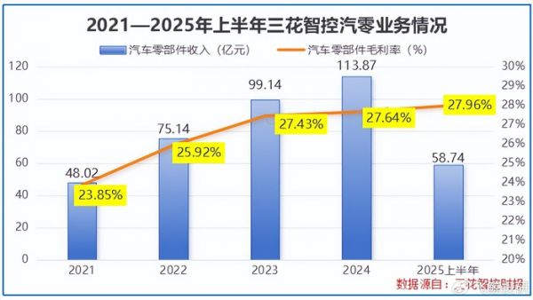 2021年至2025年上半年,三花智控汽车零部件业务毛利率并未随行业趋势走低,反而实现逆势攀升,从23.85%稳步提升至27.96%。