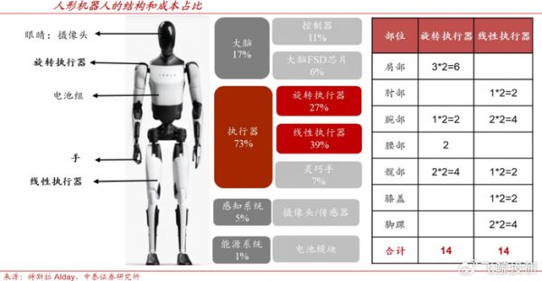作为机器人实现全身运动控制的“关节”,机电执行器又可分为旋转与线性两大类。通常一台人形机器人需要14个旋转执行器和14个线性执行器,合计成本占到整体的60%以上。