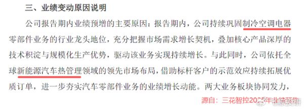 从三花智控2025年度业绩预告中可以清晰看到,当前支撑公司业绩的依旧是制冷空调电器零部件、新能源汽车热管理两大核心业务。