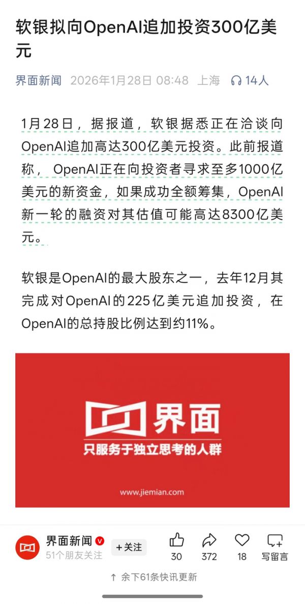 直到今天,刷到软银拟向OpenAI追加300亿美元投资的新闻,我恍然大悟。孙正义与周文强的理念其实是共通的,软银本来就不那么景气了,手里现钱不多,之前还两次梭哈过OpenAI,现在眼瞅着马上第三次了。对上了,全都对上了