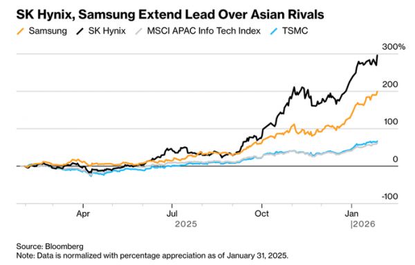 存储器行业曾经以剧烈的繁荣与萧条周期为特征,如今却实现了几年前难以想象的利润,推高了整个行业的估值。自9月初以来,三星的股价已飙升约130%,而SK海力士的股价也上涨了近两倍。