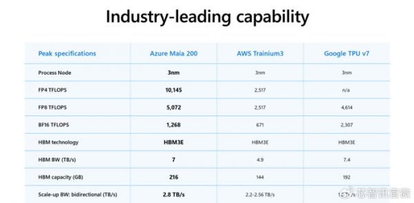 据介绍,Maia 200 采用台积电 3nm 工艺制造,配备原生 FP8/FP4 张量核心,重新设计的内存系统包含 216GB HBM3e(读写速度高达 7TB/s)和 272MB 片上 SRAM,以及能够确保海量模型快速高效运行的数据传输引擎。这使得 Maia 200 成为目前所有超大规模数据中心中性能最高的自研芯片,其 FP4 性能是第三代 Amazon Trainium 的三倍,FP8 性能更是超越谷歌第七代 TPU。Maia 200 也是微软迄今为止部署的最高效推理系统,其每美元的性能比我们目前部署的最新一代硬件提升了 30%。