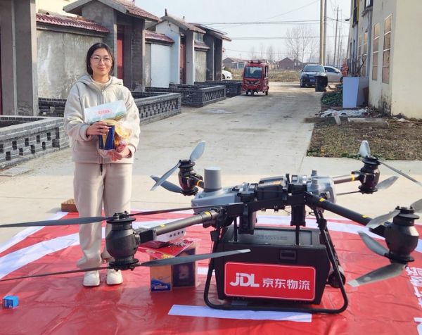 1月29日,一架京东物流无人机在光明村完成首单配送,将一份内含“福”字与春联的特别“年货礼盒”精准送达。