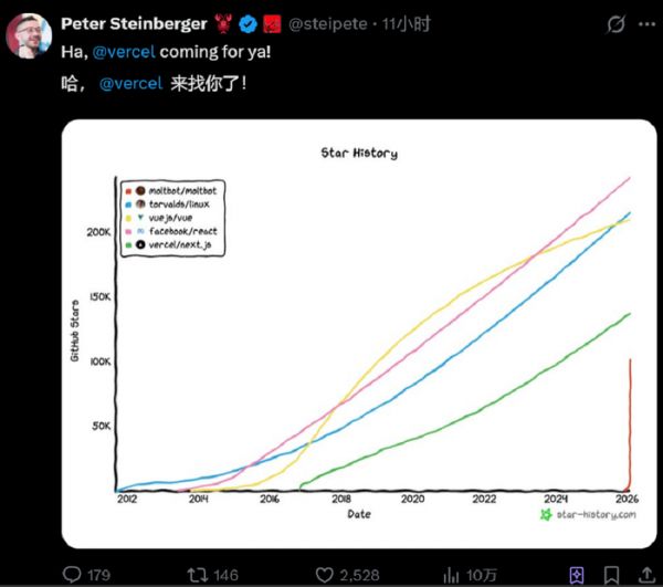 ▲Moltbot GitHub星标数量变化(图源:X平台)Moltbot背后的开发者Peter Steinberger在项目爆火后也频繁接受采访,就在昨天,他在一场时长近2小时的深度播客中,深入剖析了他对AI时代软件开发的思考。