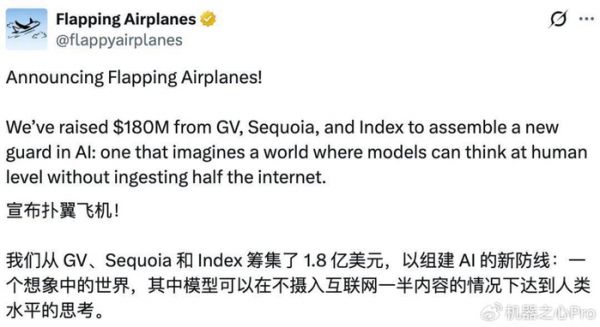 Flapping Airplanes 称,其融资用来组建 AI 的新防线:一个想象中的世界,模型可以在不用摄入互联网一半内容的情况下达到人类水平的思考。