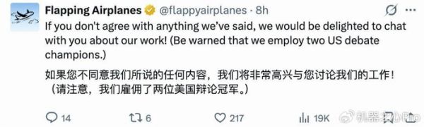 「Flapping Airplanes」这个名字,正是公司文化的写照:我们是谁、我们在做什么,本身就是 out-of-distribution 的。非常非典型的活跃性公司文化,从他们的推文中能看出一丝严谨学术之外的跳脱。