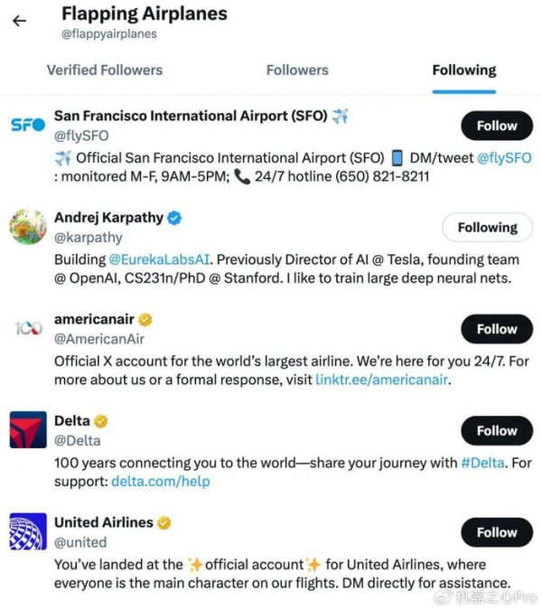 我们甚至发现,Flapping Airplanes 官方推特的关注列表里,真的有旧金山机场和两大美国航司……(这是真的要起飞了)