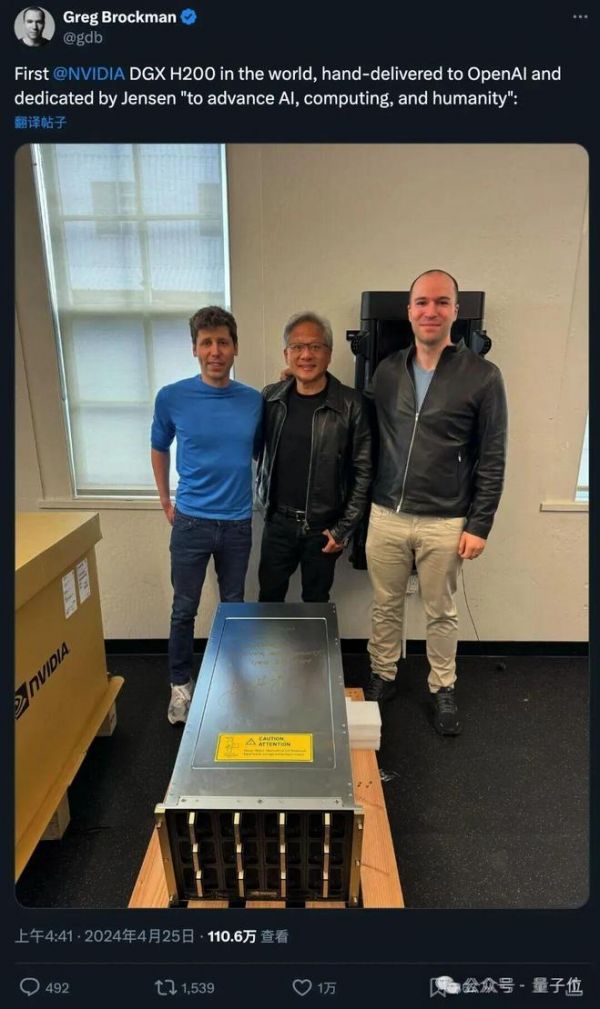 2024年4月,老黄再度亲自上门,将新一代Hopper架构旗舰超算DGX H200首台交付OpenAI,由OpenAI总裁Brockman公开晒照官宣,用于GPT-4及后续模型的研发与推理加速。