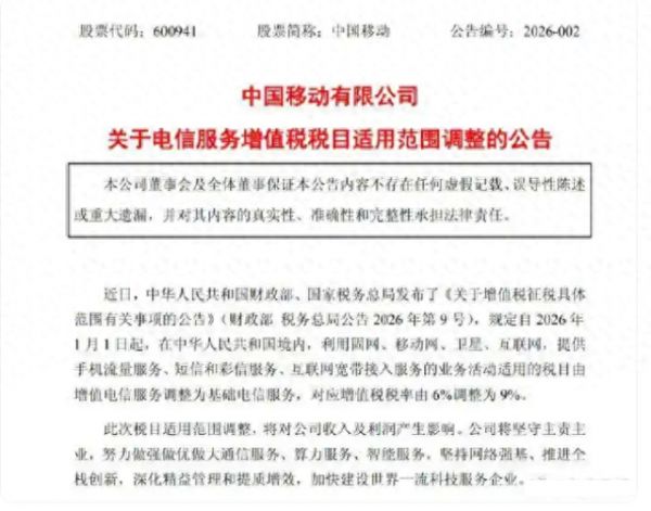 2月1日,中国移动、中国联通、中国电信三大运营商同步发布公告,手机流量、短信彩信、宽带接入等服务的增值税税率,从6%调整为9%,公告均提及这会影响公司收入和利润。消息一出,立刻引发全网热议,大家最关心的问题只有一个:这笔增加的成本会转嫁到我们身上吗?话费会变贵吗?