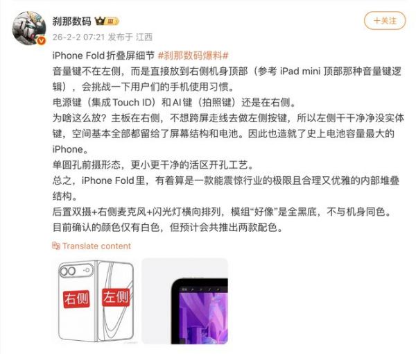 图片来源:微博关于 iPhone Fold,外界已经讨论了太多年。但直到 2026 年,这款产品才真正站在发布窗口前。从目前流出的信息来看,苹果并没有急着用折叠形态去重新定义手机,而是反过来,把折叠结构当成服务现有体验的工具。简单来说,更接近 iPad 的折叠,而非 iPhone 的展开。